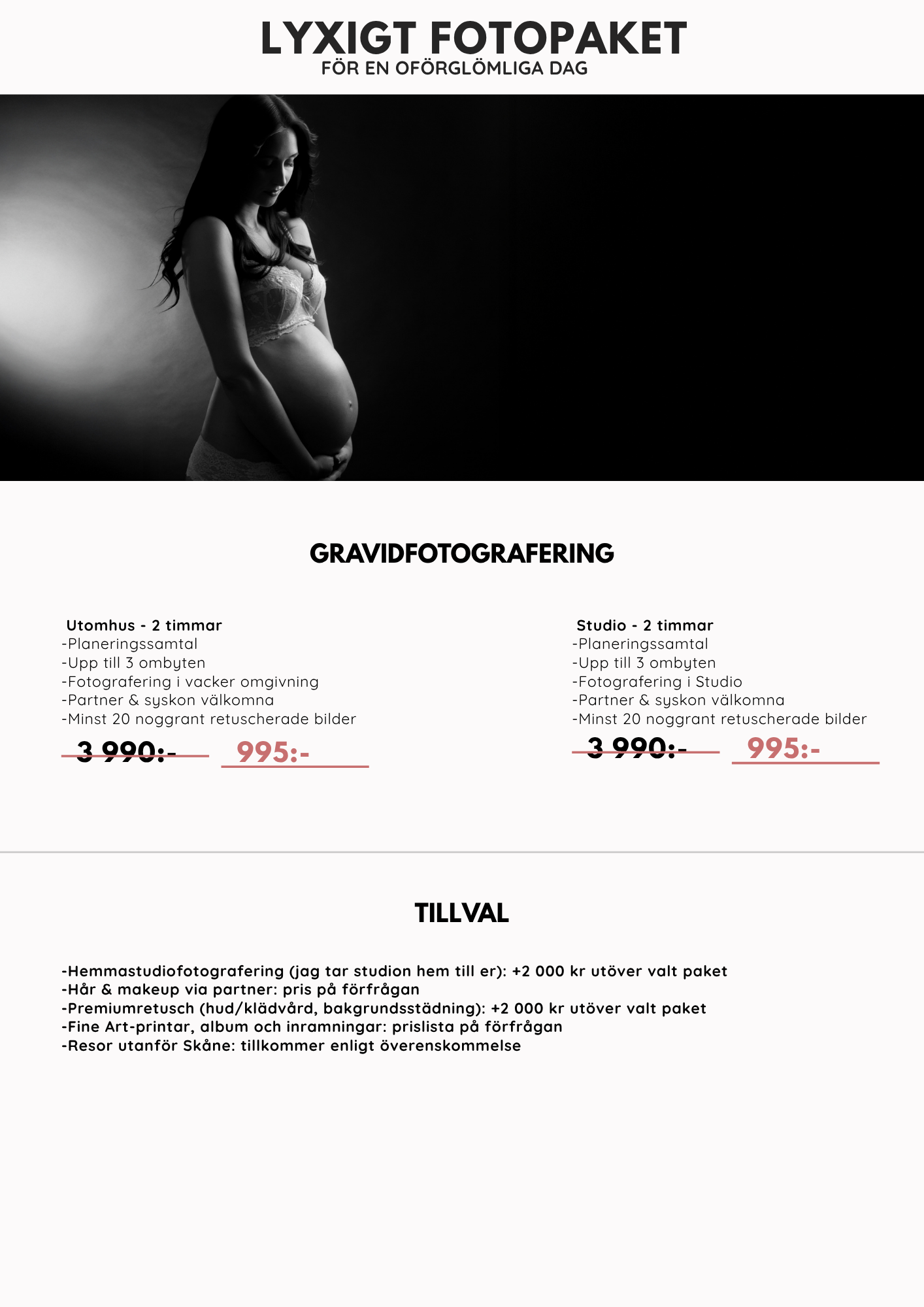 Jag erbjuder två upplägg: studiofotografering där vi styr ljussättningen exakt, eller utomhusfotografering i naturligt och vackert ljus. Efter sessionen gör jag urval och professionell retusch. Du får alla lyckade bilder (minst 20 st) levererade i högupplöst format.